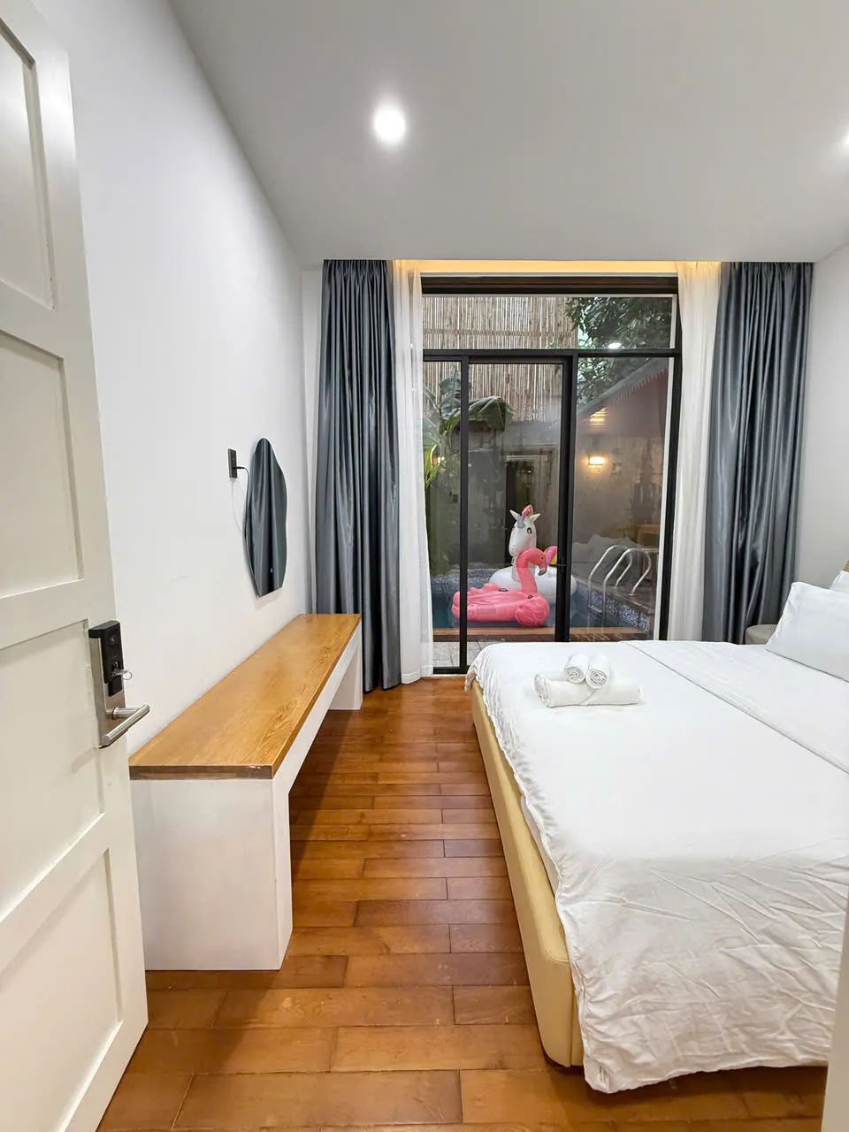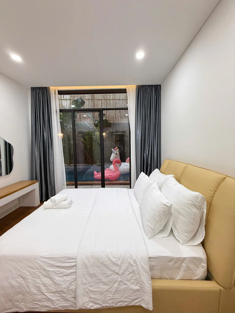 호치민 2군 타오디엔에 위치한 중형 풀빌라입니다. 1군 시내까지 약 20분 정도 소요되며 4룸 모두 동일한 크기이며 방마다 내부 화장실이 있어 무척 편리합니다.