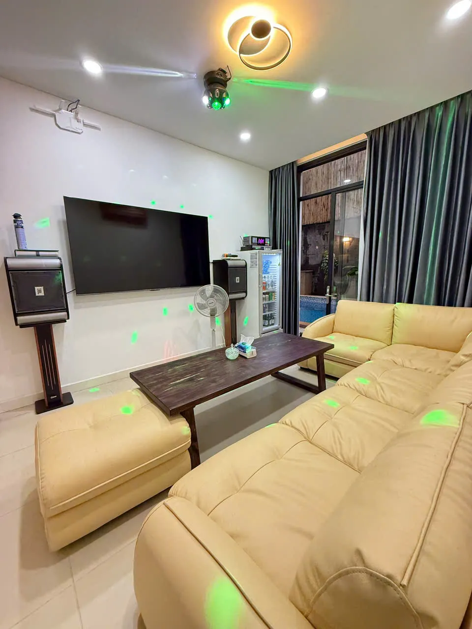 거실엔 75인치 대형 TV와 한국 가라오케 시스템. 조명이 설치 되어 있습니다.