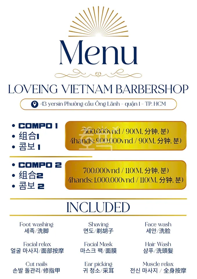 호치민 1군 이발소 거리로 불릴 만큼 수많은 이발소가 밀집한 지역입니다. 이발소 밀집지역 특성상 가격과 서비스 경쟁이 치열한 만큼, LOVEING 이발소는 합리적인 가격높은 서비스 품질을 동시에 제공합니다.